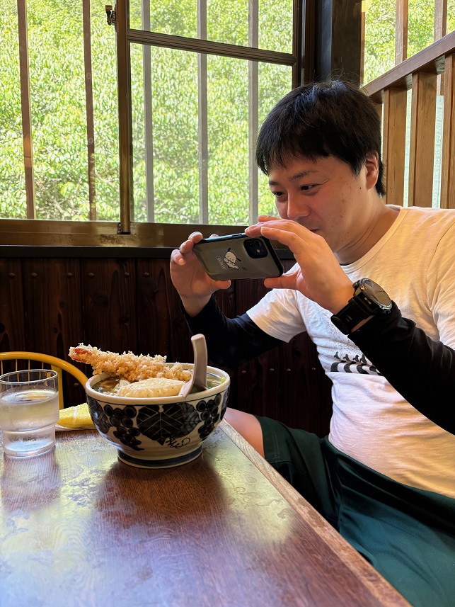 そして帰りの昼食はもく兵衛さんのカレーうどんに海老天もちトッピングです。N氏はこちらも初めてで感動の1品です💦