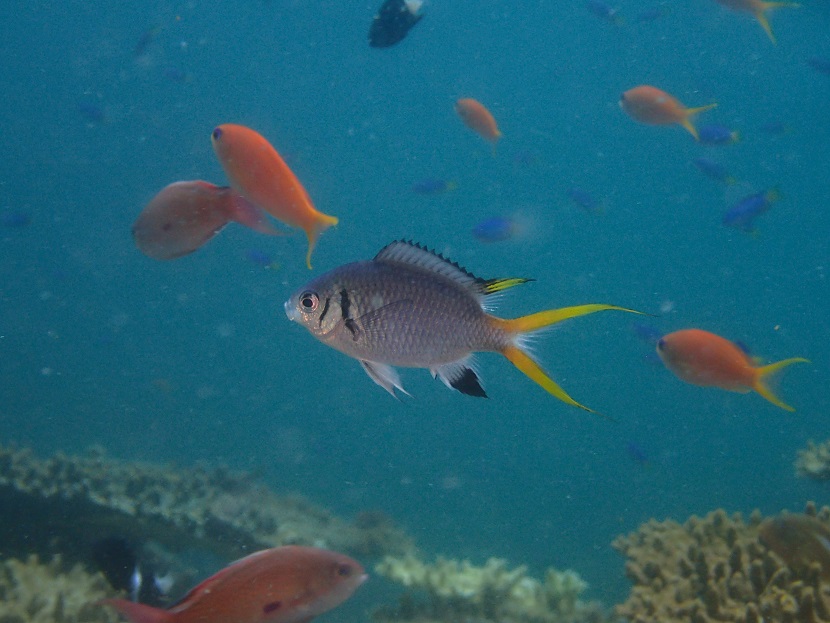 そしてもう一つご紹介しましょう~🐟大きくなると普通のスズメダイになるんですけど幼魚の時は尾びれに黄色のラインが入ってて可愛いです。サンゴの上をソラスズメダイやキンギョハナダイに交じって泳いでます。見落としがちですが探してみてください。