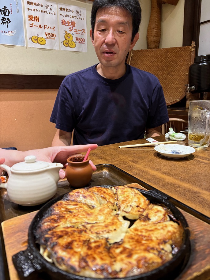 こちらは愛南夕食風景🍚 なにわさんの特性鉄鍋餃子です。外はパリッと中はジューシー🥟やけど注意です🤣