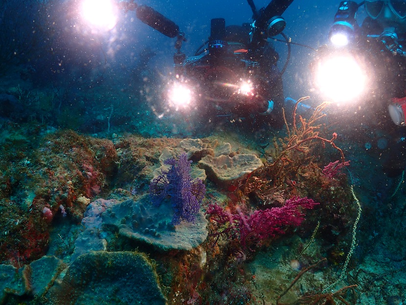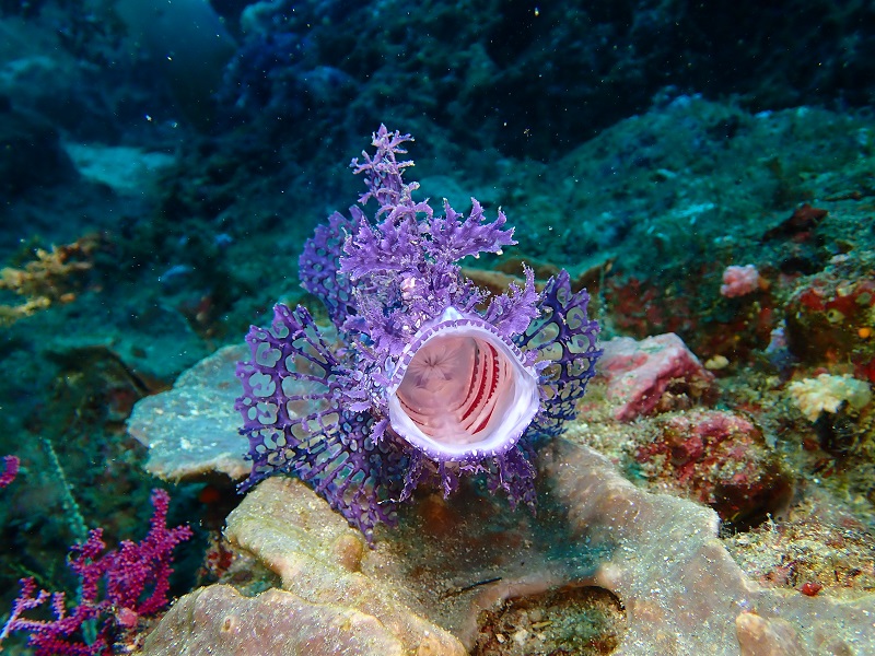 今現在愛南の目玉生物はキレイな紫のボロカサゴです。現地サービスさんのスタッフに場所をお聞きしまして行ってみると、ちゃ~んとちょこんと居りました😍 みんなにライティングされてまぶしそうなボロカサゴちゃん🤣