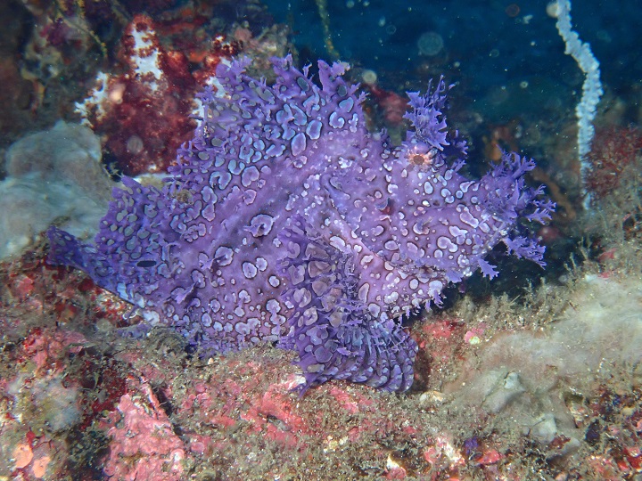 ウォーミングアップダイビングでは今愛南で大人気の紫のボロカサゴを見に行きました😻 何とも言えないキレイなパープル!そしてこの柄です🤡