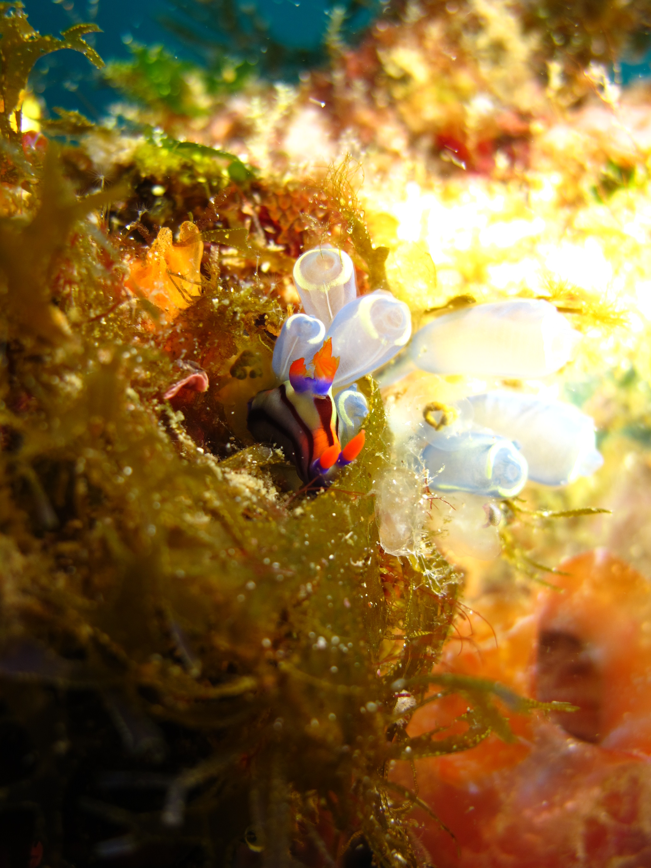 水中も温かくなったとは言えまだまだウミウシが豊富に出ています!シロミノウミウシ、ハナイロウミウシ、クロスジリュウグウウミウシ、サガミリュウグウウミウシ、下の画像はホヤに着いてるセトリュウグウウミウシ。ウミウシだけでなくホヤやケヤリと絡むとカラフルでちょっと感じが変わりますね。