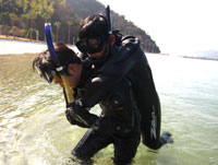 本日はレスキューコースの海洋講習を開催しました!ご参加頂いたのは、先日の学科講習に引き続きY.FさんとY.Hさんのお二人です(^-^)最初は体慣らし?で反応のないダイバーのエキジット方法から頑張って頂きました。ビーチダイビング・ボートダイビングを想定して、いろいろなエキジット方法を実践です。写真はその様子なのですが、お二人ともいつも以上に真剣です!その後、オープンウォーター講習を思い出しながらセルフレスキューの方法やエア切れのシュミレーション。そして、水面・水中トラブルの対処法など、少しずつ覚えてくり返し練習です(^-^)最初は手探りだったのですが、考えながらできるようになってきました!久しぶりの講習だから楽しい♪との声も聞くことができました(*^-^*)