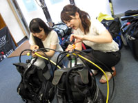 今年の夏も続々とダイバーが誕生しておりますが、本日もダイバーデビューを目指すべく、A.OさんとK.Nさんのオープンウォーターコースの学科講習を開催しました!テキストをお渡ししてからの自宅学習は、お互いにわからない所をフォーローし合いながのお勉強(^^♪その成果あって、ダイブプラナーの使い方もバッチリでした!自信がなさそうな発言と表情ではありましたが、クイズはお二人とも高得点♪ファイナルエグザムの前に質問タ~イム!バルブの種類にタンクの検査。器材の名称なども覚えて頂きつつ、いろいろな質問をしっかりして頂いての最終テスト。もちろん、余裕で合格です!おめでとうございます(≧∀≦)その後の器材セッテイングでは、バディで確認し合いながら見事に完了です!次はドキドキのプール講習です☆認定までガッチリバディー組んで頑張っていきましょうo(^O^*)o