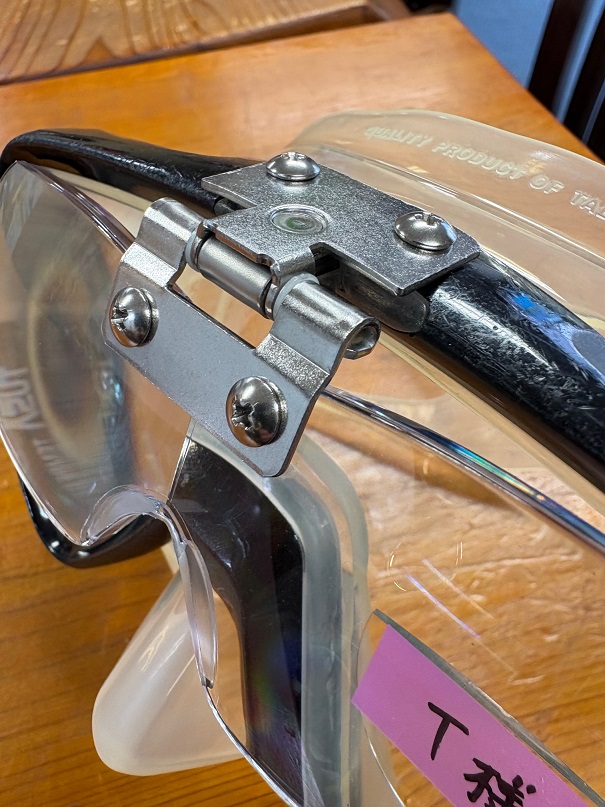 通常のプラスチックヒンジでは拡大鏡レンズがフレームと干渉して、根元のヒンジビスが打ち込めず、レンズとフレームに少し間が空く長めのステンレスヒンジで対応✌ これはこれでカッコイイ😍